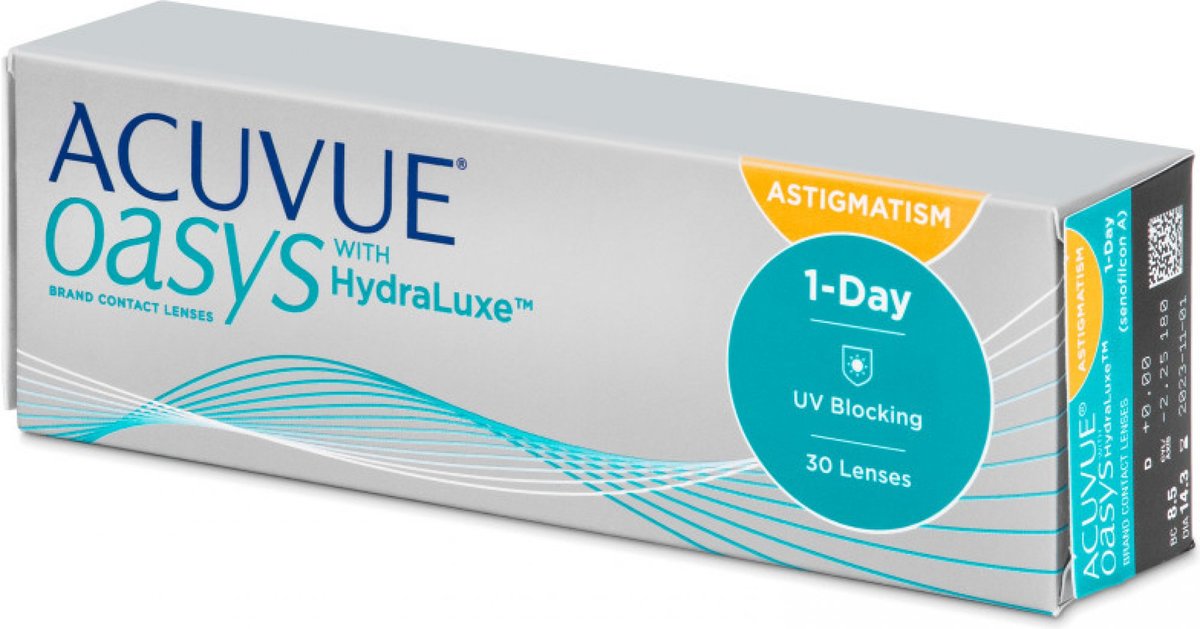 Acuvue Oasys 1-Day with HydraLuxe for Astigmatism od společnosti Johnson & Johnson jsou vyrobeny z prodyšného silikon-hydrogelového materiálu, který je ošetřený technologií HydraLuxe. Čočky mají každodenní periodu výměny a slouží ke korekci astigmatismu.
