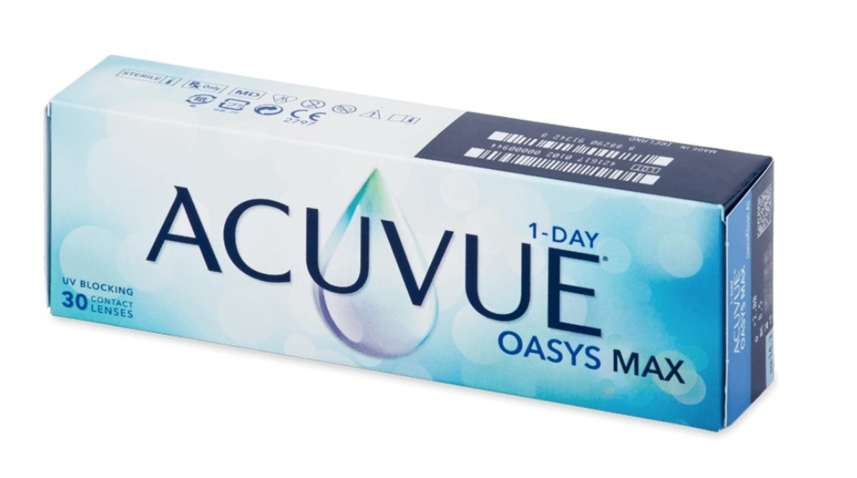 Silikon-hydrogelové kontaktní čočky ACUVUE® OASYS MAX 1-Day ™ nabízí celodenní komfort a snížení pocitu únavy očí při práci s digitálním zařízením. Materiál čoček disponuje technologií OptiBlue™ Light Filter a TearStable™ Technology.