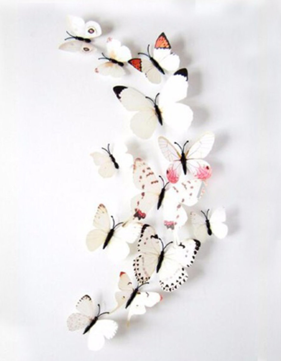 Dekorační motýlci na zeď. Každý motýlek má na tělíčku ohraničené malé magnetické kolečko, do kterého vlepíte oboustranou samolepku. Poté už stačí jen nalepit na jakoukoliv suchou hladkou plochu. Pokud toto místo nepřelepíte, lze použít i na plochu kovou jako magnet.