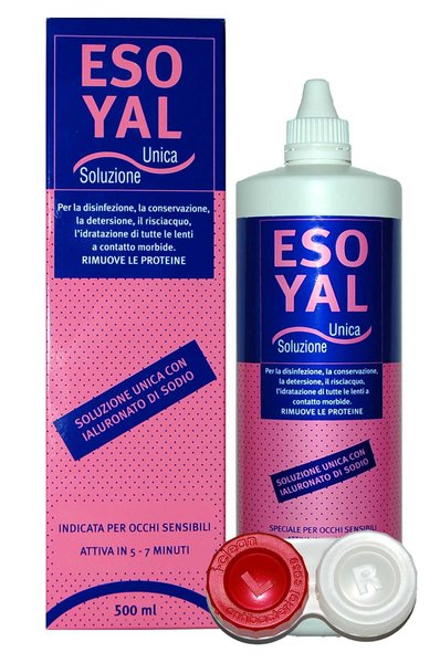 ESO YAL 500 ml - speciálně vyvinutý roztok pro EXTRA HYDRATACI všech měkkých kontaktních čoček! ESO YAL čistí, hydratuje, desinfikuje, oplachuje a uchovává všechny typy měkkých čoček. Perfektní a příjemná hydratace čoček a tím i celého oka je způsobena hyaluronátem sodným, který na sebe dokáže vázat molekuly vody a tím způsobuje, že prakticky mizí pocit suchých očí při nošení kontaktních čoček. Při velikosti balení 500 ml je též znamenitý poměr výkonu a ceny roztoku ESO YAL.