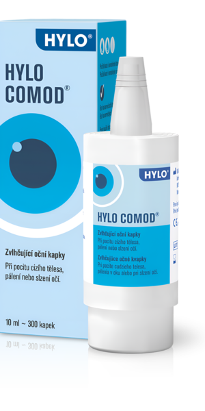 Hylo-Comod 10 ml je sterilní roztok obsahující kyselinu hyaluronovou, která je látkou tělu vlastní. Vyskytuje se v oku i v jiných částech těla a díky tomu má schopnost vytvářet stejnoměrný, stabilní a dlouhodobě setrvávající film na povrchu oka, který se neodplavuje ani nezhoršuje vidění, proto dokáže rychle odstranit pocit pálení, suchého oka, nebo cizího tělíska v oku. Hylo-Comod neobsahuje konzervační látky a je bezpečný z hlediska dlouhodobého kapání. Hylo-Comod je určen pro nositele kontaktních čoček měkkých, ale i tvrdých. Při jeho používání nedochází k tvorbě usazenin na povrchu kontaktních čoček.