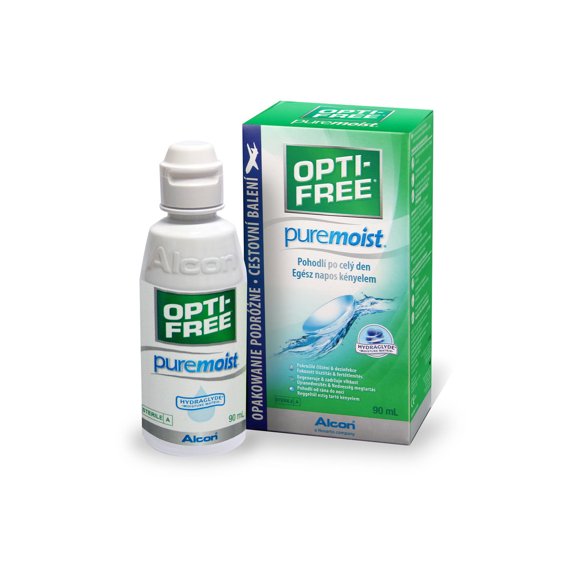 OPTI-FREE PureMoist obsahuje účinnou látku HydraGlyde, která dokáže obalit čočky zvlhčující složkou bez nutnosti spolupráce slzného filmu. Složka EDTA odstraňuje nečistoty z čoček. Šetrná, ale zároveň důkladná desinfekce čoček roztokem OPTI-FREE PureMoist a účinnost proti plísním, dělají z tohoto roztoku velmi dobrou volbu pro péči o všechny měkké hydrogelové a silikon-hydrogelové čočky.