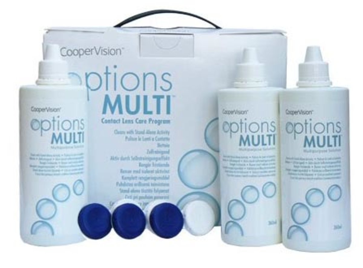 Options Multi 3 x 360 ml je výhodný balíček víceúčelového roztoku na všechny typy měkkých kontaktních čoček. Obsahuje hydratační složku a povrchově aktivní látky zabraňující usazování proteinových a lipidových depozit na kontaktních čočkách. Options Multi 3 x 360 ml je dodáván i s pouzdry na kontaktní čočky.
