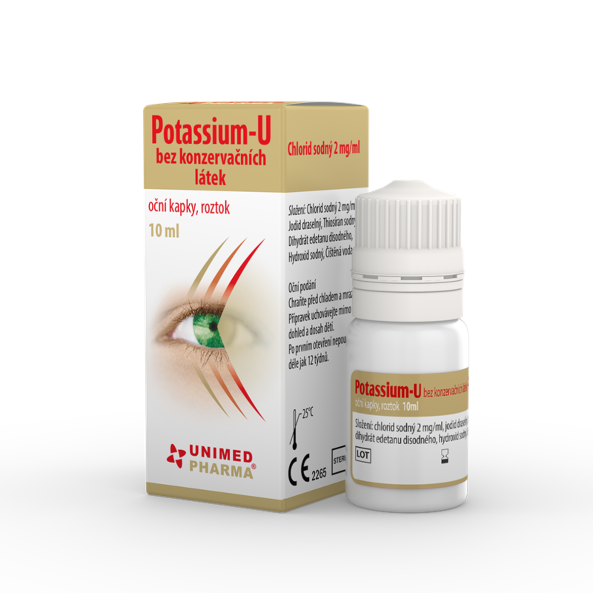 Potassium-U bez konzervačních látek je vhodný pro zvlášť citlivé oči, kterým prospívají oční kapky s jodidem draselným. Je vhodný k podpůrné léčbě při nepříjemných zákalcích v očích, které se projevují jako „létající mušky“. Neobsahuje žádné konzervační látky ani antimikrobiální přísady, čímž významně snižuje dráždění oka. Potassium-U výrazně upravuje osmolaritu slz a tak pomáhá k lepšímu komfortu vidění.