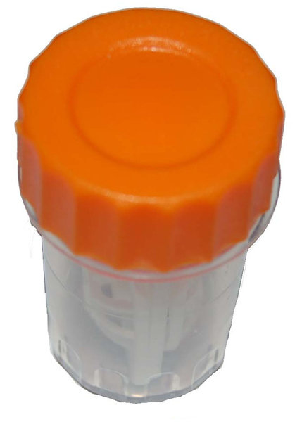 Středně hluboké plastové pouzdro oranžové. Kontaktní čočky pečlivě vložte do výklopných košíčků a zaklapněte. Dávejte pozor aby se kontaktní čočky nepřiskříply. Tato pouzdra nepoužívat k roztokům na peroxidové bázi!