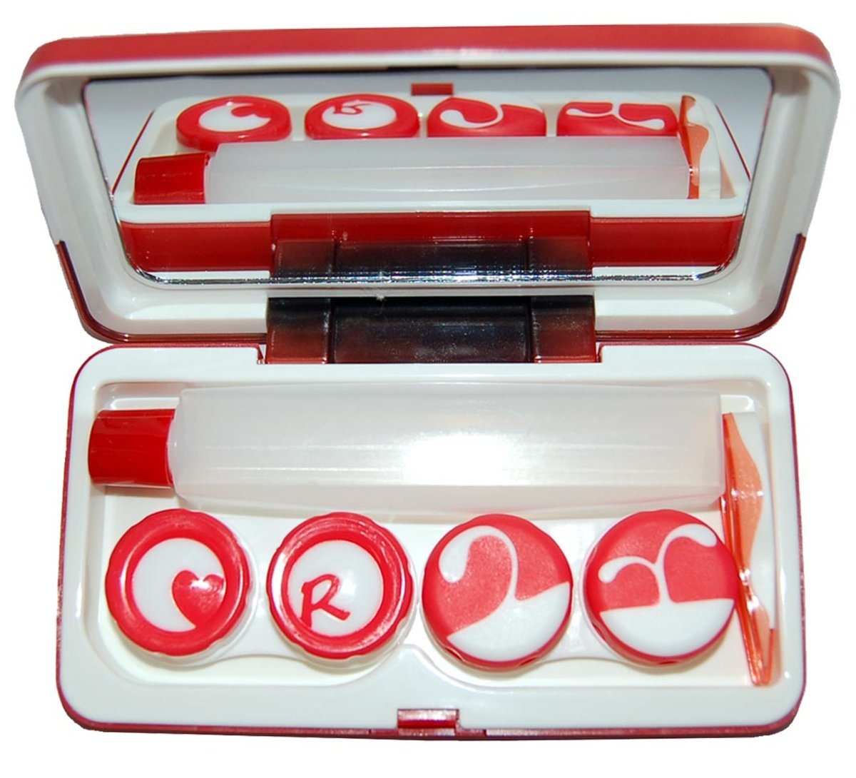 Pouzdro - dvojitá sestava - tato pouzdra obsahují dvě vnitřní plastová pouzdra na kontaktní čočky ve stejné barvě pouzdra, pinzetku a nádobku na roztok. V pouzdře je zrcátko pro snažší aplikaci kontaktních čoček na cestách. Celé uzavíratelné.
