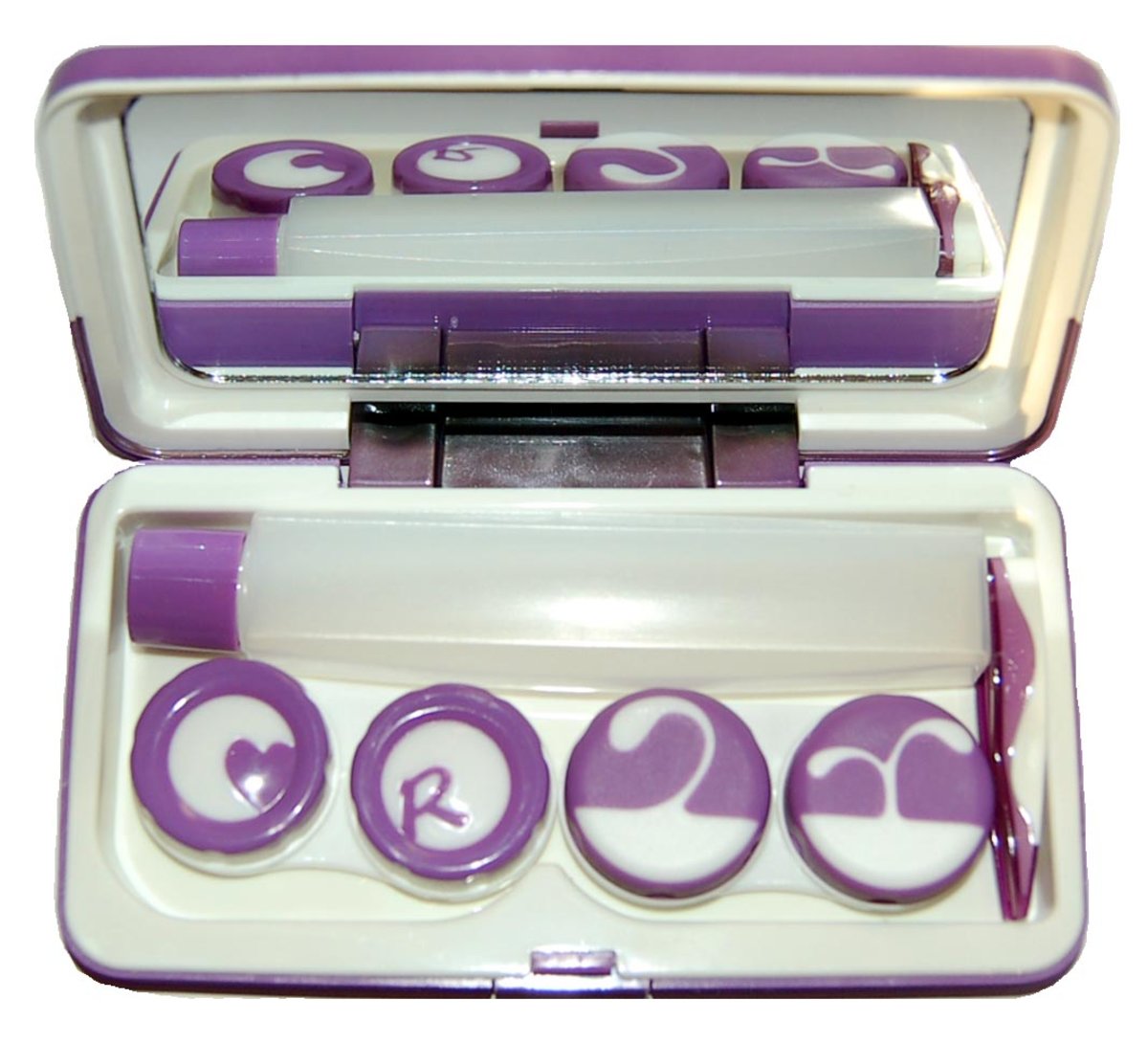 Pouzdro - dvojitá sestava - tato pouzdra obsahují dvě vnitřní plastová pouzdra na kontaktní čočky ve stejné barvě pouzdra, pinzetku a nádobku na roztok. V pouzdře je zrcátko pro snažší aplikaci kontaktních čoček na cestách. Celé uzavíratelné.