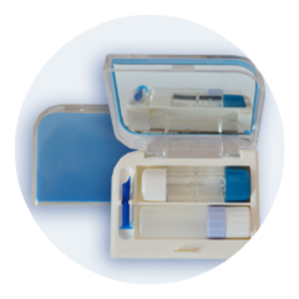 Pouzdro na tvrdé čočky - sestava - obsahuje plastové pouzdro na tvrdé kontaktní čočky, aplikátor, zrcátko a nádobkou na roztok. Tvrdé kontaktní čočky vložte mezi "packy" úchytů na čočky, které jsou přidělány k jednotlivým, barevně odlišeným víčkům. Do nádobky nalijte čistící roztok určený pro péči o tvrdé kontaktní čočky a nechte působit. Dodržujte návody k použití, protože se u různých roztoků mohou měnit.