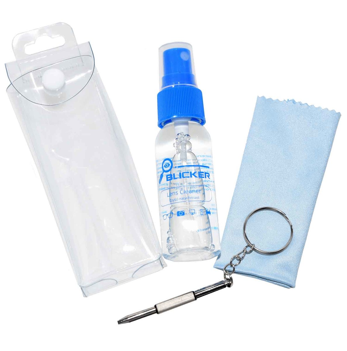 Sada obsahuje: hadřík z kvalitního mikrovlákna 10x15 cm; oboustranný šroubováček na brýlové šroubky (x/-) a čistící sprej 30 ml.