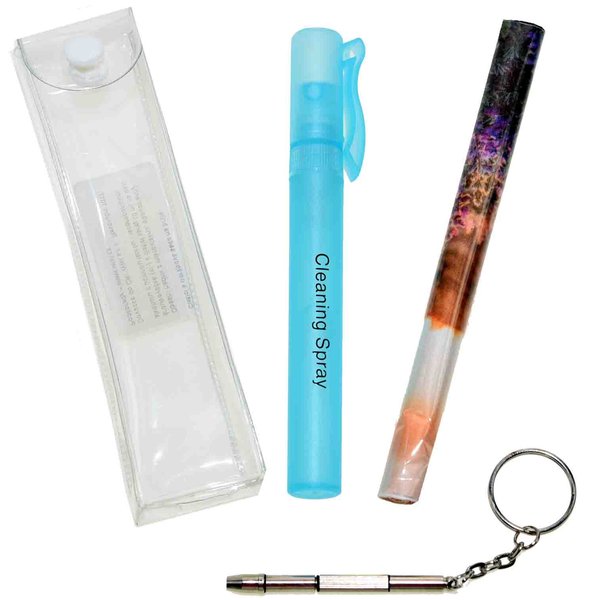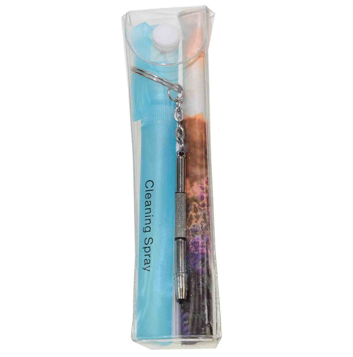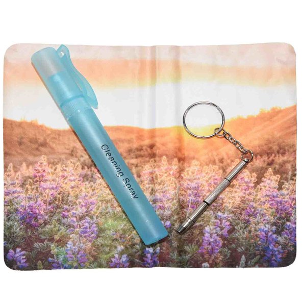 Zakoupili jste si čistící a údržbovou sadu určenou primárně na brýle. Sada obsahuje: hadřík z kvalitního mikrovlákna 15x17 cm; oboustranný šroubováček na brýlové šroubky (x/-) a čistící sprej 10 ml.