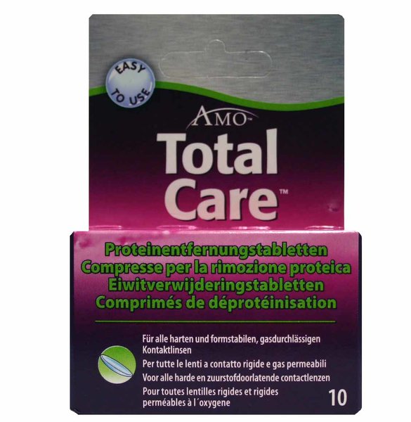 TOTAL Care tablety slouží pro enzymatické odstraňování bílkovin ze všech tvrdých (pevných) plynopropustných kontaktních čoček. Tablety TOTAL Care se přidávají do naplněného pouzdra TOTAL Care roztokem, kdy jsou kontaktní čočky již dokonale mechanicky očištěné a uchycené v držácích pouzdra. Používá se pouze jedna tableta do naplněného pouzdra pro obě kontaktní čočky. Kontaktní čočky s enzymatickou tabletou jsou v pouzdře minimálně 6 hodin. Tak jako je tomu i u dezinfekce. Poté se mohou kontaktní čočky opět použít. Před použitím kontaktních čoček po enzymatickém čištění je potřeba kontaktní čočky důkladně opláchnout TOTAL Care roztokem.