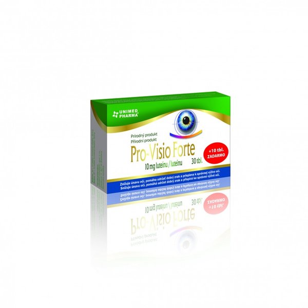 Pro-Visio Forte – přírodní produkt se zvýšeným obsahem luteinu. Komplexní doplněk stravy se zvýšeným obsahem luteinu a zeaxantinu, s výtažkem z borůvek, s vitamínem E a selenem, který je vhodný ke snížení rizika vzniku a progrese degenerativních onemocnění očí (např. Věkem Podmíněné Makulární Degenerace – VPMD), zvláště vhodný je před a po operaci šedého zákalu (katarakty), a k šetření trávicího traktu. Tablety se svěží chutí borůvek se cumlají. Přípravek je vhodný pro oči namáhané dlouhým čtením, pro oči namáhané u monitoru počítače nebo televize. Je vhodný pro oči starších osob jako předcházení ztráty zraku kvůli věkem podmíněné degeneraci sítnice. Je zvláště vhodný pro oči namáhané noční jízdou v autě. Oči po operaci šedého zákalu chrání před světlem, které nadměrně proniká do oka přes umělou nitrooční čočku. Mohou jej užívat i diabetici.
