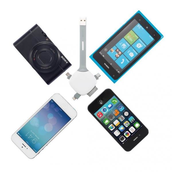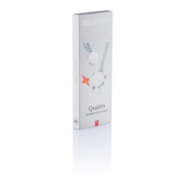 Quatro přináší 4 nejčastější zástrčky v jediném kabelu: Apple Lightning, Apple Dock, Micro USB a Mini USB. Nyní můžete mít všechny pohromadě, takže nikdy nebudete bez pravého konektoru. Díky kovovému kroužku si můžete dát i jako přívěsek na klíče.